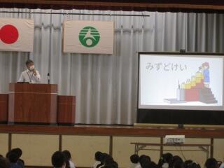 今月の全校朝会では、校長先生から「時の記念日」の話や
