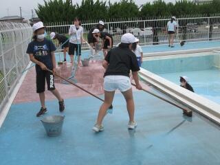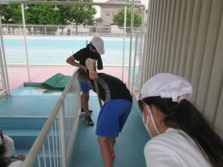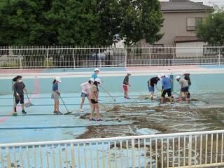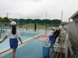 来週のプール開きに向けて、5・6年生がプール清掃をしました。