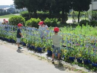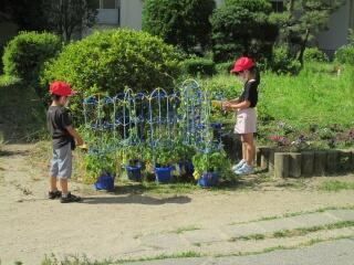 登校して身支度が終わると1年生はアサガオに水をあげに行きます。