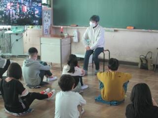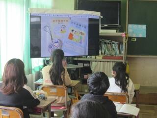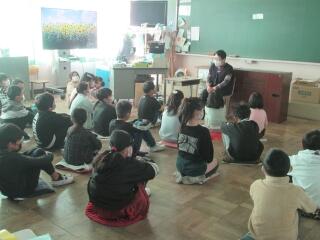 5年生が「いのちの授業・ヒラメ養殖」で学んだことを4年生に伝えました。