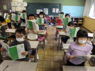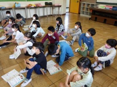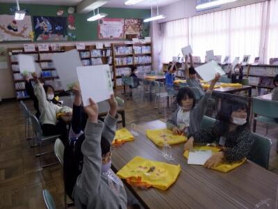2年生が、黄色い読書バッグとともに図書室へやってきました。