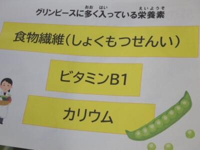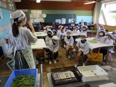 栄養士の先生に、さやのむき方を教えてもらいます。