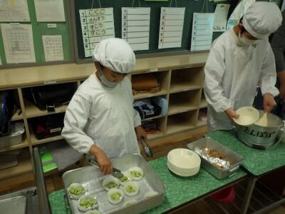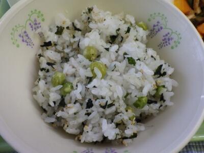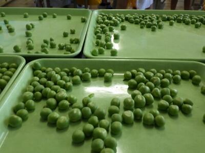 むいたグリンピースは、給食の「グリンピース入りわかめごはん」になります。