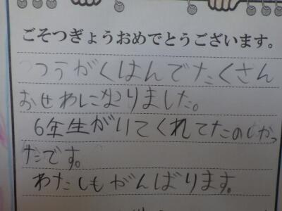 1年生の教室、廊下側には6年生へのお礼のメッセージが掲示されています。