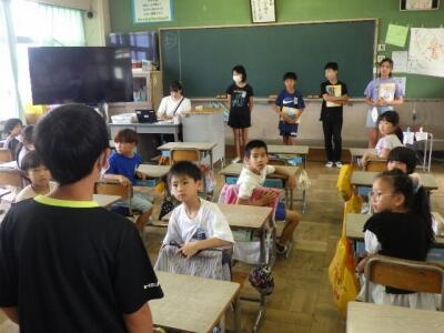 牛島小の子どもたちに向かって、みんなであいさつをしました。
