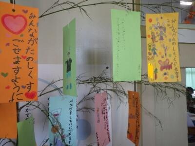 2年生の廊下に七夕の笹飾りがあります。