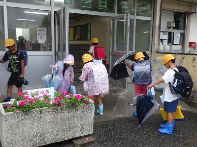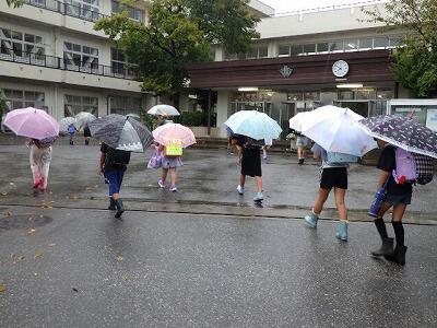明け方には激しい雨が降っていましたが、登校時には弱まりました。