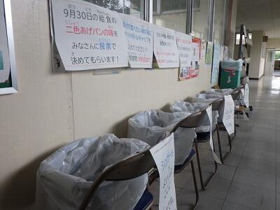 ペットボトルキャップの投票で、9月30日の給食の二色あげパンの味を決めてもらいます。