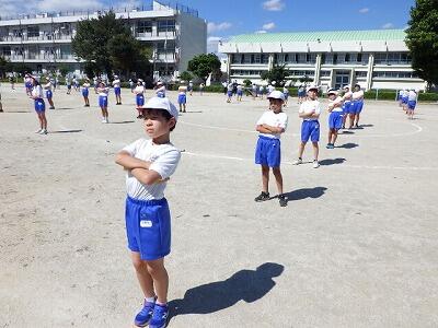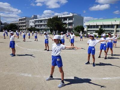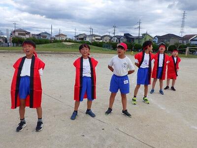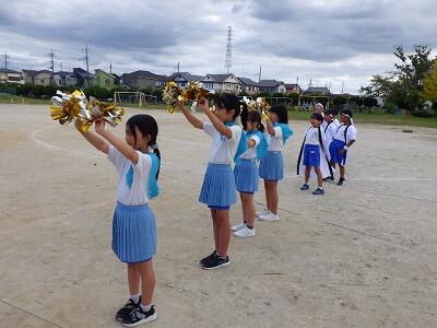 応援係は校庭で応援の練習をしました。