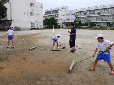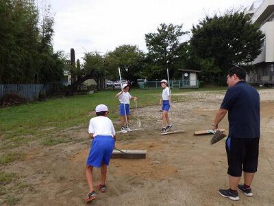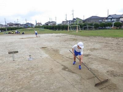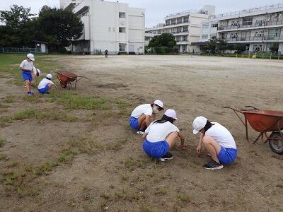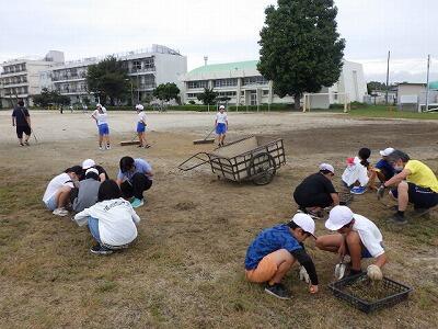 全員が一生懸命に除草と整地を行い、雨上がりの校庭が整備されました。