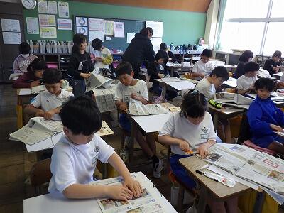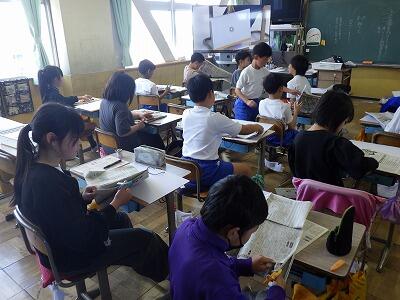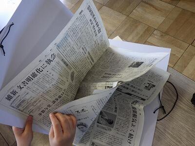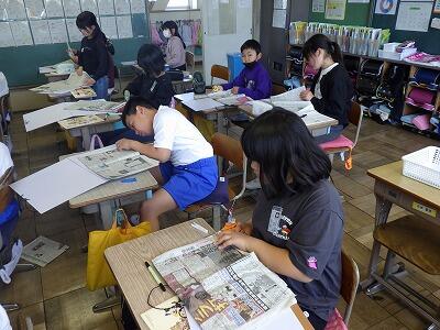 4年生の教室では新聞紙で何かを作っていました。