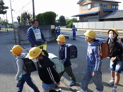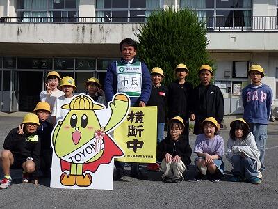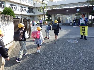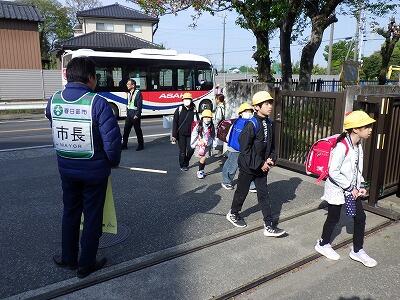 春日部市交通事故防止対策本部、本部長の市長さんが正門で立哨指導をしてくださいました。