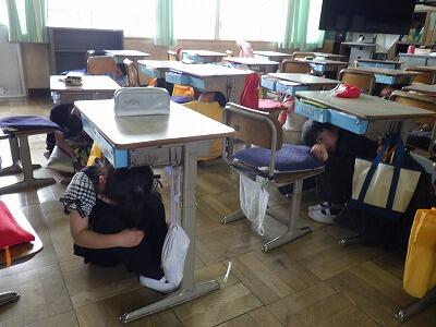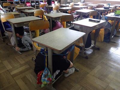 放送が入ると素早く机の下に身を隠します。