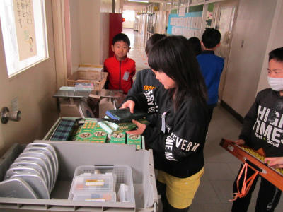 子供たちが、楽しみにしている「コスモスランチ」です。これは、なかよしグループ(縦割りグループ)で食べる給食です。普段と違い、おにぎりとおかずとジュースのメニューなので、子供たちは食べやすい上に遠足気分で食べられるから、毎回大人気の給食です。