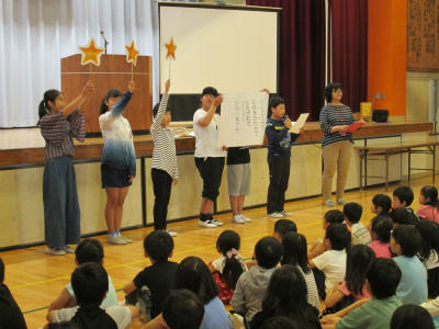 5月1日は、豊野小学校145回目の誕生日です。そこで、5月の全校朝会は、145年の歴史について、校長がスライドを使って話しました。