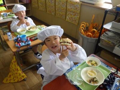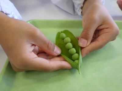 栄養士の先生に、さやのむき方を教えてもらいます。