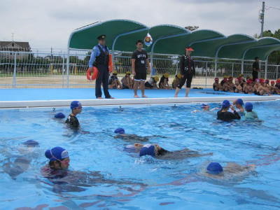 今日は、6年生が着衣水泳を行いました。特別に、富田警部補が水難事故防止についての指導もしてくださいました。