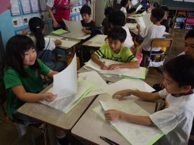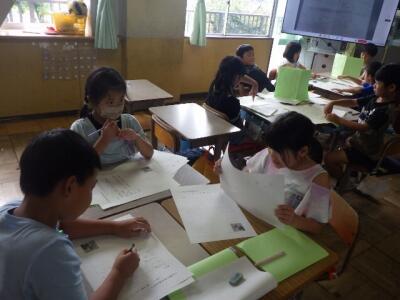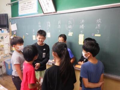 児童会室では、代表委員が運動会のときに掲示するスローガンを書いていました。
