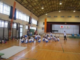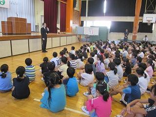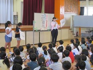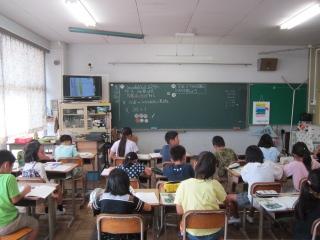 今月の生活目標を話す教師と調べたデータを発表する子供。