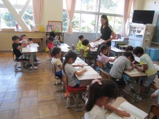本の世界に入り、スクリーンを見ながら、しっかり聞いている子供たち。