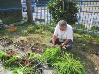 昨年、用務員のお力添えいただいたおかげできれいに咲いたニッコウキスゲ。今日、用務員さんと一緒に株分けを行いました。