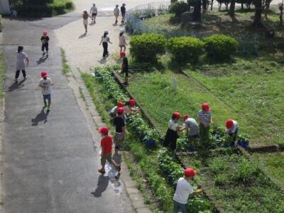 理科室前のベランダから、全校児童の集合写真を撮影します。