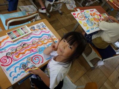 今日はクレヨンで人や生きもの、植物などを描き足しました。