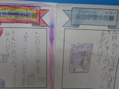 2階通路に、自主学習ノートをやり終えた児童の写真(令和5年度)を掲示しています。