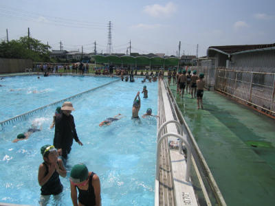6年生が、昨年に続き、着衣水泳を行いました。洋服を着て水に入ると、こんなに大変に・・・。ペットボトルを持って浮いています。