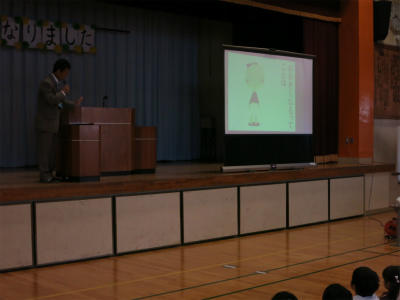 最後に、校長先生から2つのお話がありました。1つは、朝の本のお話の「大きくなる」ことの意味。2つめは、普段からあいさつ、返事の声をしっかり出すことが、危険から逃れるときに「助けて-!」という大きな声につながるということを教わりました。