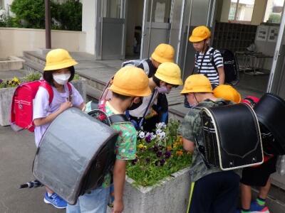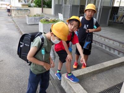 昇降口で何かを発見したようです。