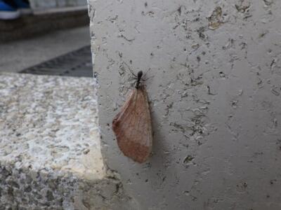 ありが蝶の羽を運んでいます。