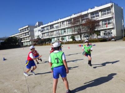 3時間目、校庭では5年生がタグラグビーをしていました。
