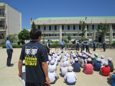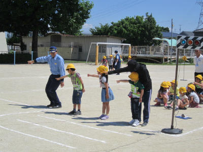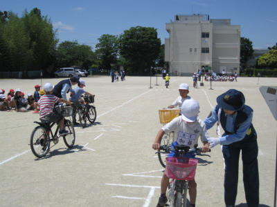 1年生の交通安全教室を校庭で行いました。「道路の安全な歩き方」について、富田警部補はじめ、春日部警察、交通指導員、春日部市役所の10名の方々から、ご指導いただきました。みんな真剣そのものでした。