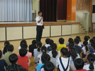 はじめに体育主任の先生の話を聞き、プールの約束を確認しました。