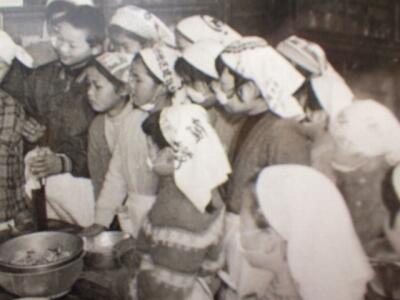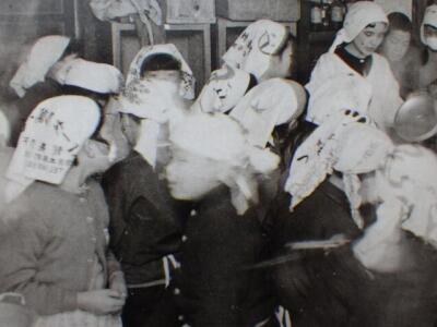 当時は三角巾やバンダナではなく、手ぬぐいを巻いていました。