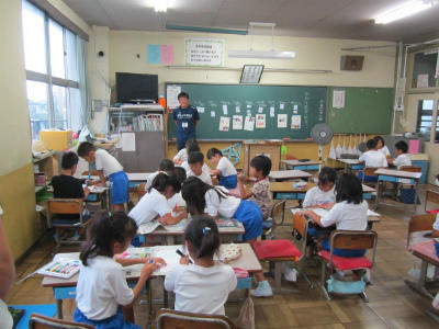 クイズ、自分の行動などについて、考えたり、手を挙げたりして、子供たちは夢中で話に引き込まれています。