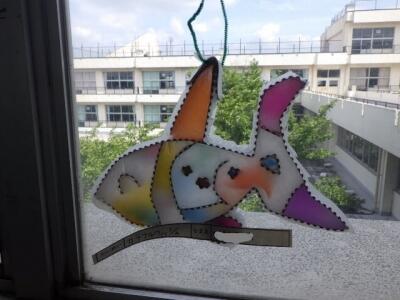 3年生の廊下の窓に、図工の作品が展示してありました。