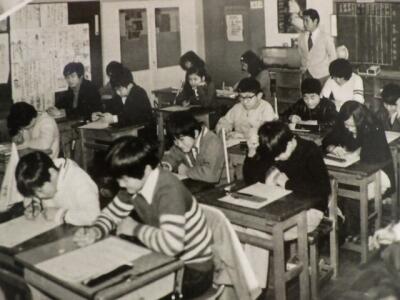テストの時間。当時は人数が多かったので、机を離してもわずかなすき間しかありませんでした。