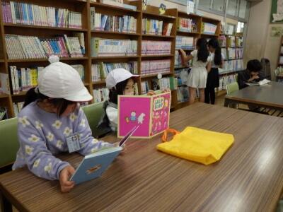 今日は雨で外遊びができなかったこともあり、図書室は大盛況でした。