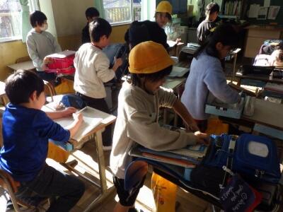 工夫しながらランドセルに荷物を詰め込んでいきます。