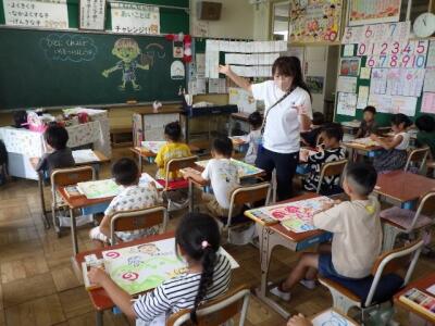今日はクレヨンで人や生きもの、植物などを描き足しました。