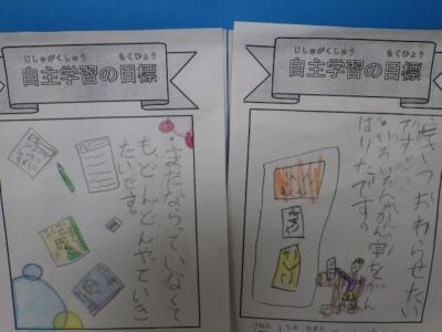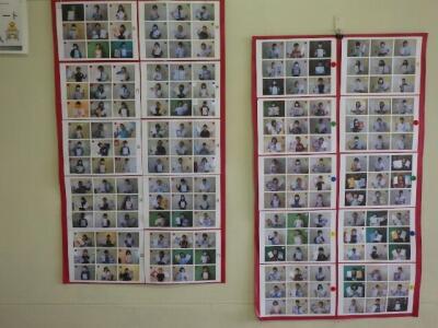 2階通路に、自主学習ノートをやり終えた児童の写真(令和5年度)を掲示しています。