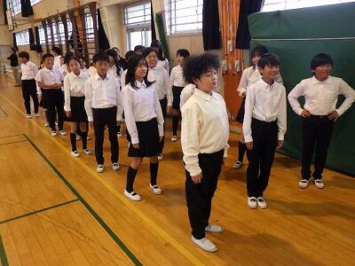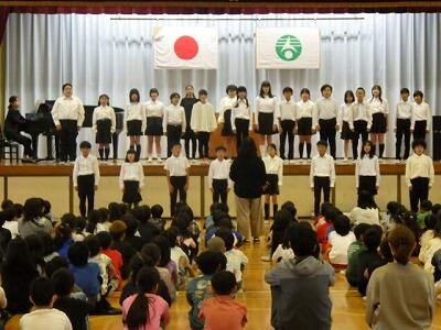 次に、市内音楽会に出場する5年生が、全校児童の前で合唱しました。
