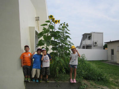 3年生が育てているひまわりが、こんなに大きく・・・・!(体育館脇)