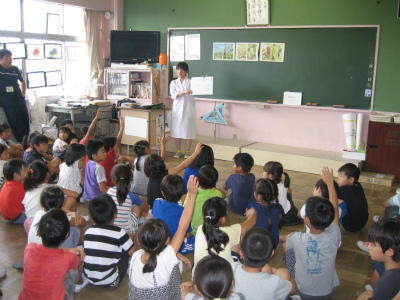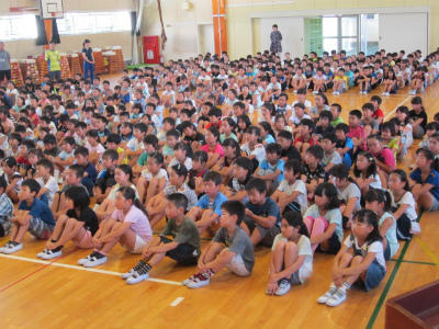 豊野駐在所から、富田警部補を招いて、毎年実施してる安全朝会を行いました。夏休みを前に、安全な生活を送る大事な話をしていただき、改めて多くの危険を学びました。