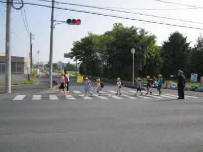 交通指導員さんやお母さん方にも、笑顔で元気なあいさつです。