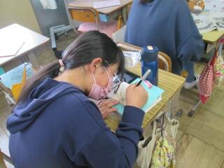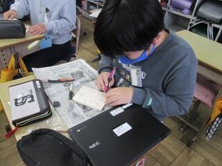 思い思いのデザインを板に描き、彫刻刀で彫っています。