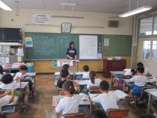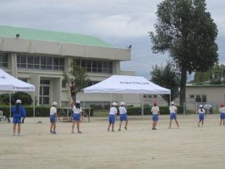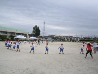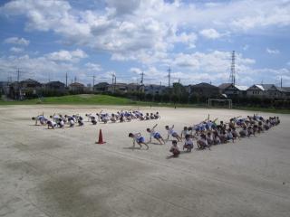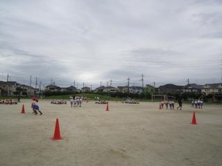3年生は、「台風の目」。後方では、4年生が、徒競走の走る順番とコースの確認。