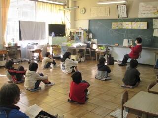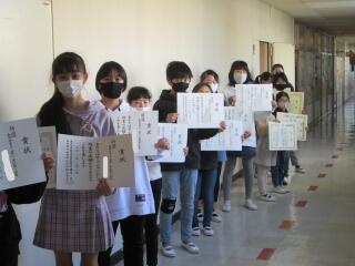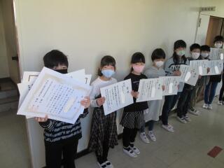 放送室で行った表彰朝会で、たくさんの賞状を渡しました。